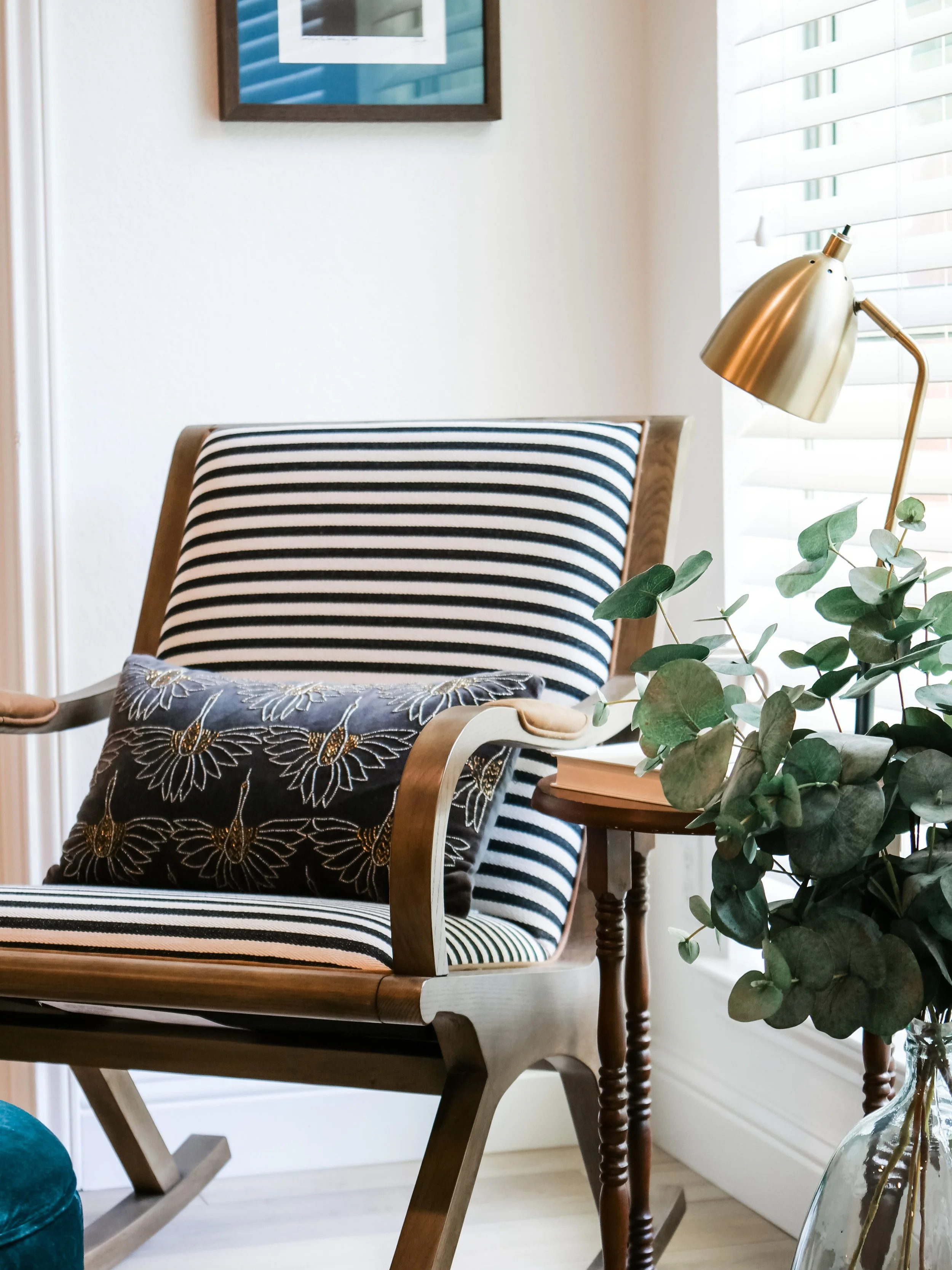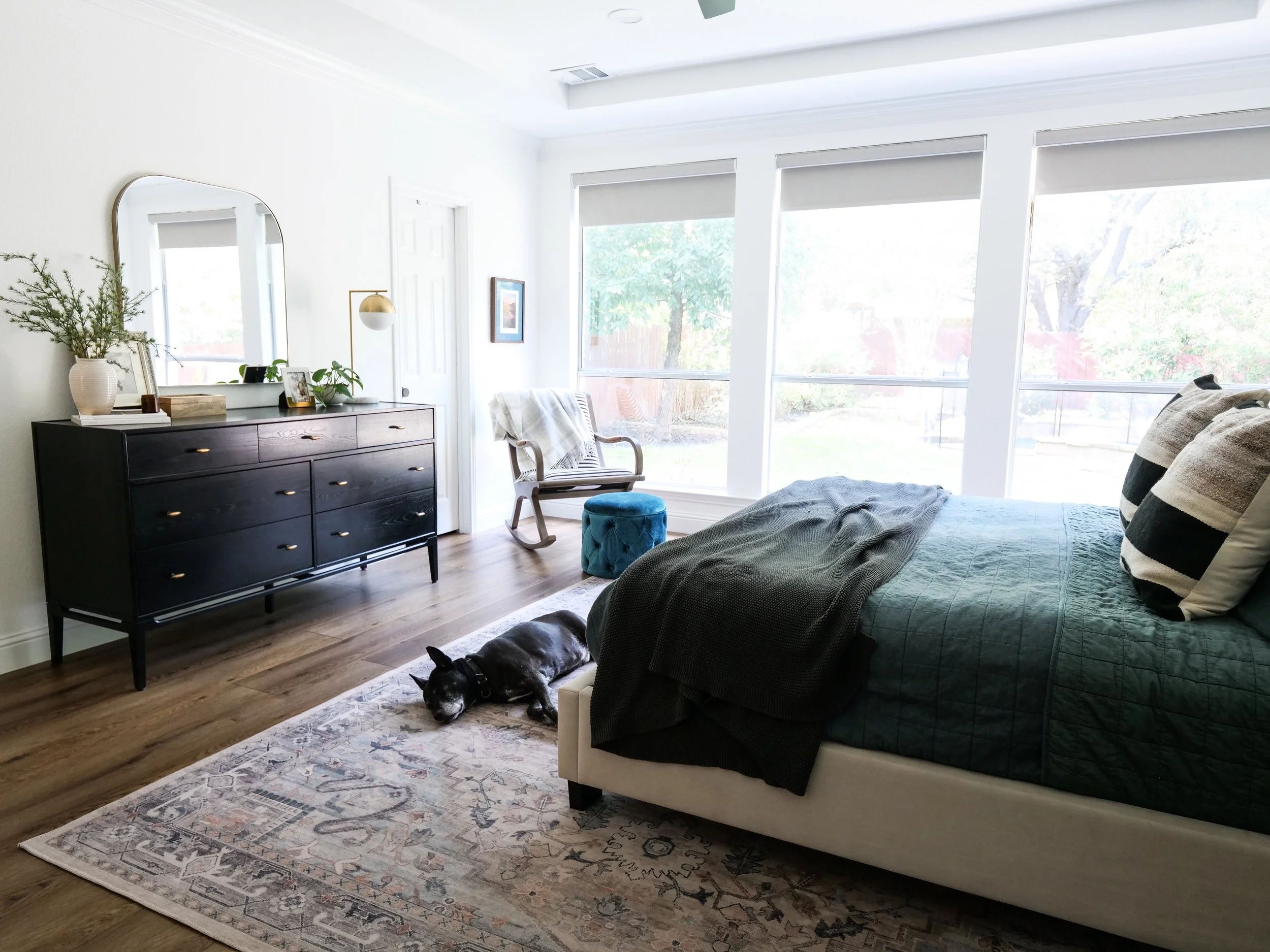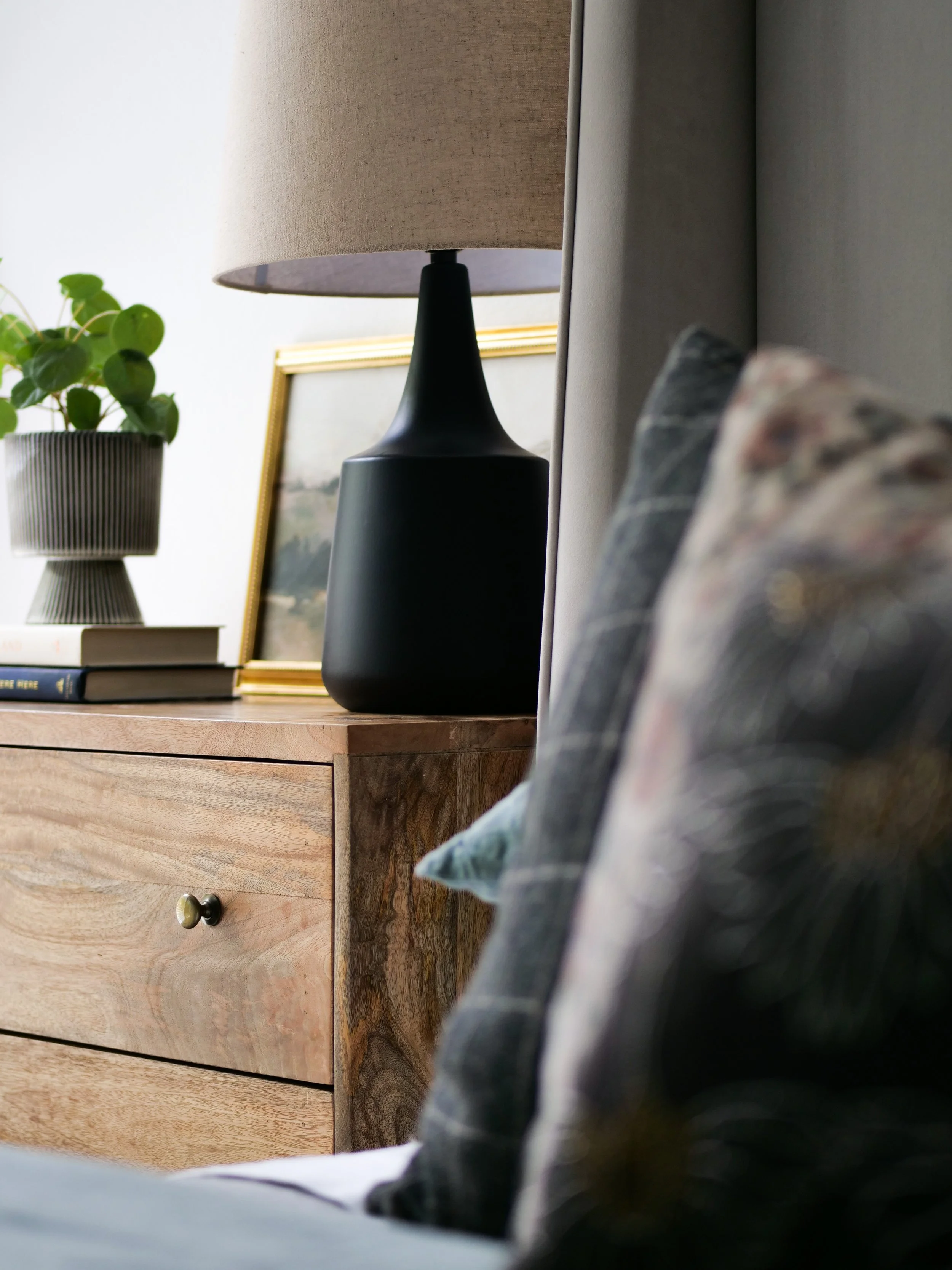 We wanted this space to be soft, warm, and eclectic. A combination of wood tones, a range of fabrics from floral to geometric, and pops of foliage create effortless, cozy character in this primary suite.